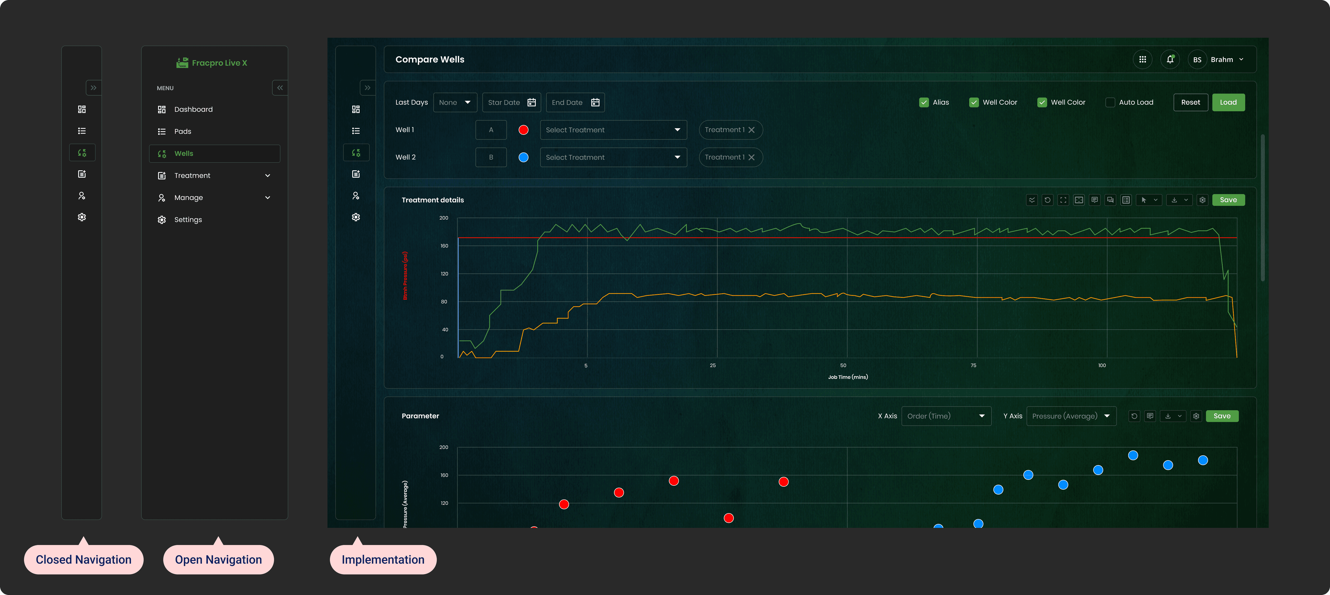 Legacy tools often bury critical features inside nested dropdowns (e.g., File > Open > Simulation > Live). We moved to a permanent, collapsed Left Sidebar. This maximizes the horizontal screen real estate—crucial for viewing wide-pressure graphs—while keeping the primary modules (Wells, Treatment, Settings) reachable with a single click.